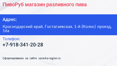 ПивоРуб, магазин разливного пива по адресу Краснодарский край, Гостагаевская, 1-й (Колос) проезд, 16а в дальнейшем Организация, размещена в следующих категориях: