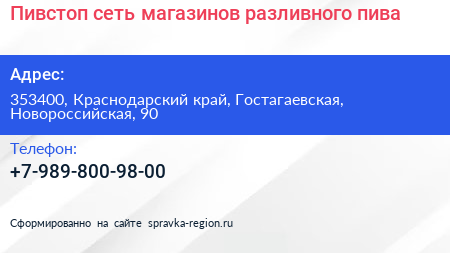 Пивстоп, сеть магазинов разливного пива по адресу 353400, Краснодарский край, Гостагаевская, Новороссийская, 90 в дальнейшем Организация, размещена в следующих категориях: