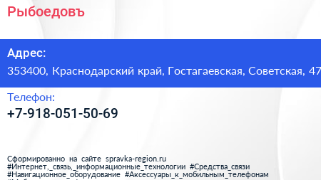 Рыбоедовъ по адресу 353400, Краснодарский край, Гостагаевская, Советская, 47 в дальнейшем Организация, размещена в следующих категориях: