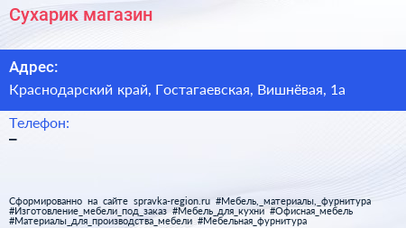 Сухарик, магазин по адресу Краснодарский край, Гостагаевская, Вишнёвая, 1а в дальнейшем Организация, размещена в следующих категориях: