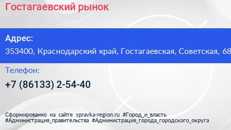 Гостагаевский рынок по адресу 353400, Краснодарский край, Гостагаевская, Советская, 68 в дальнейшем Организация, размещена в следующих категориях: