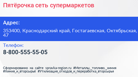 Пятёрочка, сеть супермаркетов по адресу 353400, Краснодарский край, Гостагаевская, Октябрьская, 47 в дальнейшем Организация, размещена в следующих категориях:
