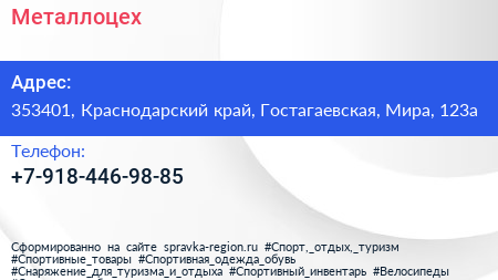 Металлоцех по адресу 353401, Краснодарский край, Гостагаевская, Мира, 123а в дальнейшем Организация, размещена в следующих категориях: