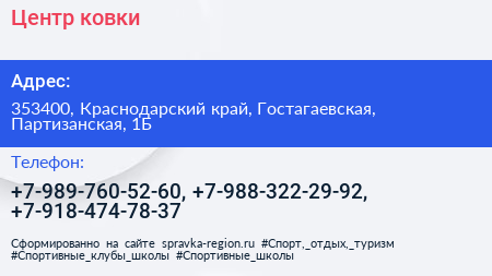 Центр ковки по адресу 353400, Краснодарский край, Гостагаевская, Партизанская, 1Б в дальнейшем Организация, размещена в следующих категориях: