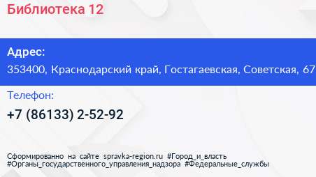 Библиотека №12 по адресу 353400, Краснодарский край, Гостагаевская, Советская, 67 в дальнейшем Организация, размещена в следующих категориях: