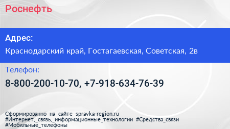 Роснефть по адресу Краснодарский край, Гостагаевская, Советская, 2в в дальнейшем Организация, размещена в следующих категориях: