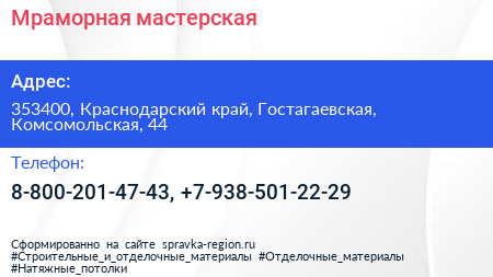 Мраморная мастерская по адресу 353400, Краснодарский край, Гостагаевская, Комсомольская, 44 в дальнейшем Организация, размещена в следующих категориях: