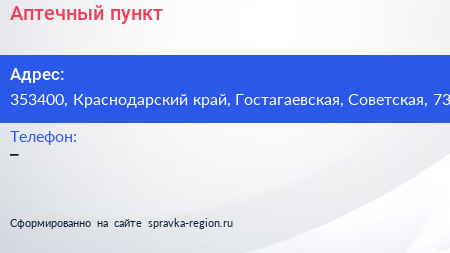 Аптечный пункт по адресу 353400, Краснодарский край, Гостагаевская, Советская, 73 в дальнейшем Организация, размещена в следующих категориях: