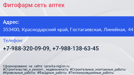 Фитофарм, сеть аптек по адресу 353400, Краснодарский край, Гостагаевская, Линейная, 44 в дальнейшем Организация, размещена в следующих категориях: