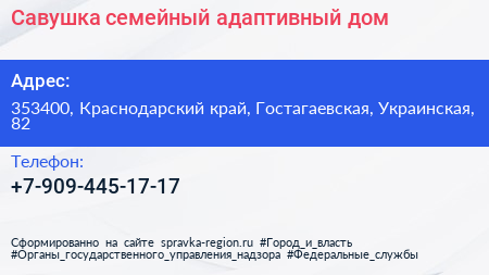 Савушка, семейный адаптивный дом по адресу 353400, Краснодарский край, Гостагаевская, Украинская, 82 в дальнейшем Организация, размещена в следующих категориях: