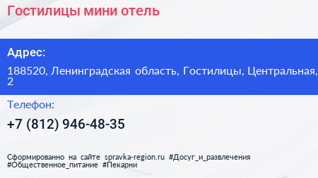 Гостилицы, мини-отель по адресу 188520, Ленинградская область, Гостилицы, Центральная, 2 в дальнейшем Организация, размещена в следующих категориях: