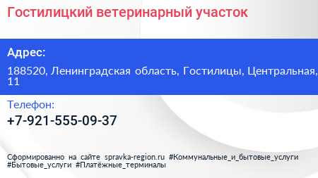 Гостилицкий, ветеринарный участок по адресу 188520, Ленинградская область, Гостилицы, Центральная, 11 в дальнейшем Организация, размещена в следующих категориях:
