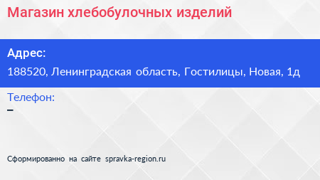 Магазин хлебобулочных изделий по адресу 188520, Ленинградская область, Гостилицы, Новая, 1д в дальнейшем Организация, размещена в следующих категориях: