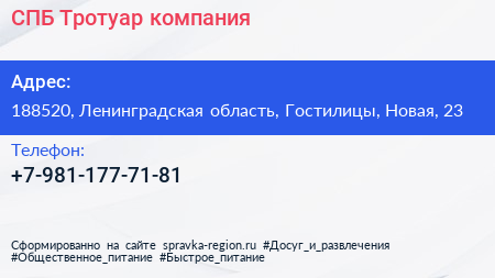 СПБ-Тротуар, компания по адресу 188520, Ленинградская область, Гостилицы, Новая, 23 в дальнейшем Организация, размещена в следующих категориях: