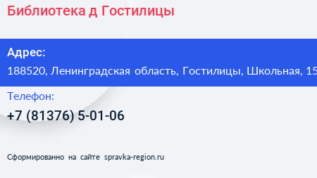 Библиотека, д. Гостилицы по адресу 188520, Ленинградская область, Гостилицы, Школьная, 15 в дальнейшем Организация, размещена в следующих категориях: