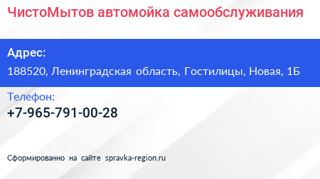 ЧистоМытов, автомойка самообслуживания по адресу 188520, Ленинградская область, Гостилицы, Новая, 1Б в дальнейшем Организация, размещена в следующих категориях: