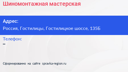 Шиномонтажная мастерская по адресу Продовольственный магазин, 22-й проезд, СНТ «Фауна», Пениковское сельское поселение, Ломоносовский район, Ленинградская область, Северо-Западный федеральный округ, Россия в дальнейшем Организация, размещена в следующих категориях: