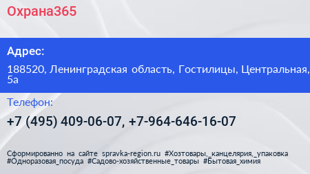 Охрана365 по адресу 188520, Ленинградская область, Гостилицы, Центральная, 5а в дальнейшем Организация, размещена в следующих категориях: