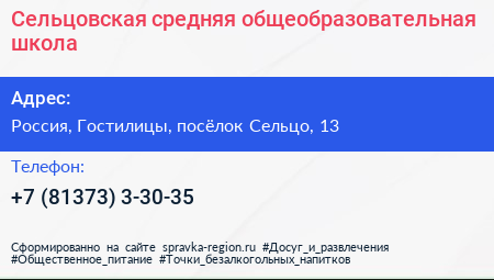 Сельцовская средняя общеобразовательная школа по адресу Сельцовская Общеобразовательная Школа, «Нарва», Сельцо, Клопицкое сельское поселение, Волосовский район, Ленинградская область, Северо-Западный федеральный округ, 188422, Россия в дальнейшем Организация, размещена в следующих категориях: