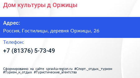 Дом культуры, д. Оржицы по адресу Клуб, 26, Школьная улица, Оржицы, Оржицкое сельское поселение, Ломоносовский район, Ленинградская область, Северо-Западный федеральный округ, 188527, Россия в дальнейшем Организация, размещена в следующих категориях: