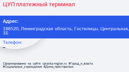 ЦУП, платежный терминал по адресу 188520, Ленинградская область, Гостилицы, Центральная, 1Б в дальнейшем Организация, размещена в следующих категориях: