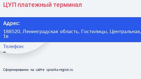 ЦУП, платежный терминал по адресу 188520, Ленинградская область, Гостилицы, Центральная, 1в в дальнейшем Организация, размещена в следующих категориях: