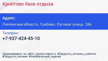 Кроптово, база отдыха по адресу Пензенская область, Грабово, Луговая улица, 18а в дальнейшем Организация, размещена в следующих категориях: