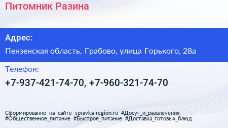 Питомник Разина по адресу Пензенская область, Грабово, улица Горького, 28а в дальнейшем Организация, размещена в следующих категориях: