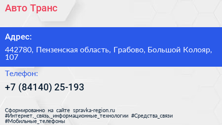 Авто-Транс по адресу 442780, Пензенская область, Грабово, Большой Колояр, 107 в дальнейшем Организация, размещена в следующих категориях: