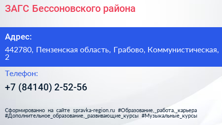 ЗАГС Бессоновского района по адресу 442780, Пензенская область, Грабово, Коммунистическая, 2 в дальнейшем Организация, размещена в следующих категориях: