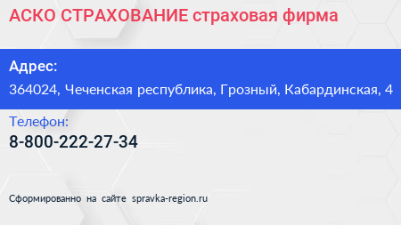 АСКО-СТРАХОВАНИЕ, страховая фирма по адресу 364024, Чеченская республика, Грозный, Кабардинская, 4 в дальнейшем Организация, размещена в следующих категориях: