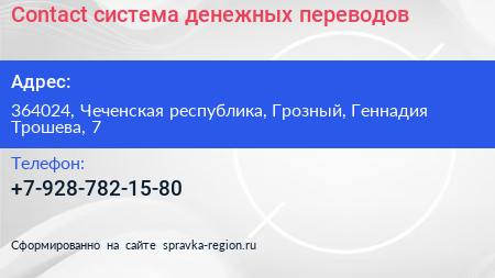 Contact, система денежных переводов по адресу 364024, Чеченская республика, Грозный, Геннадия Трошева, 7 в дальнейшем Организация, размещена в следующих категориях: