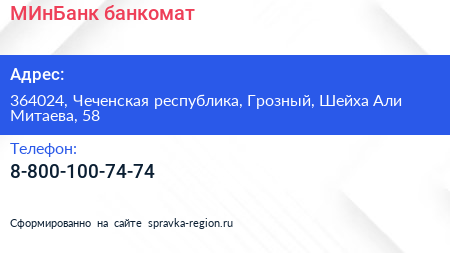 МИнБанк, банкомат по адресу 364024, Чеченская республика, Грозный, Шейха Али Митаева, 58 в дальнейшем Организация, размещена в следующих категориях: