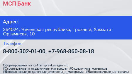 МСП Банк по адресу 364024, Чеченская республика, Грозный, Хамзата Орзамиева, 10 в дальнейшем Организация, размещена в следующих категориях: