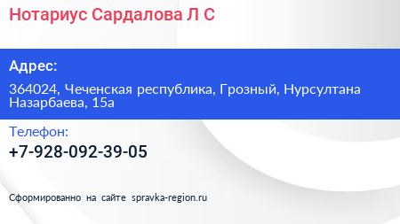 Нотариус Сардалова Л.С. по адресу 364024, Чеченская республика, Грозный, Нурсултана Назарбаева, 15а в дальнейшем Организация, размещена в следующих категориях: