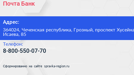Почта Банк по адресу 364024, Чеченская республика, Грозный, проспект Хусейна Исаева, 85 в дальнейшем Организация, размещена в следующих категориях: