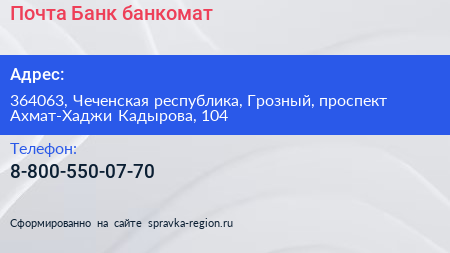 Почта Банк, банкомат по адресу 364063, Чеченская республика, Грозный, проспект Ахмат-Хаджи Кадырова, 104 в дальнейшем Организация, размещена в следующих категориях: