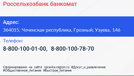 Россельхозбанк, банкомат по адресу 364015, Чеченская республика, Грозный, Узуева, 146 в дальнейшем Организация, размещена в следующих категориях: