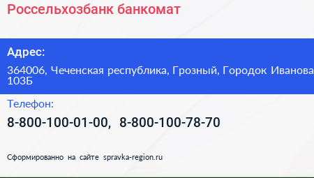 Россельхозбанк, банкомат по адресу 364006, Чеченская республика, Грозный, Городок Иванова, 103Б в дальнейшем Организация, размещена в следующих категориях: