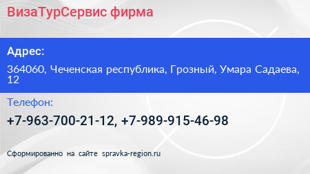 ВизаТурСервис, фирма по адресу 364060, Чеченская республика, Грозный, Умара Садаева, 12 в дальнейшем Организация, размещена в следующих категориях: