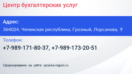 Центр бухгалтерских услуг по адресу 364024, Чеченская республика, Грозный, Лорсанова, 9 в дальнейшем Организация, размещена в следующих категориях: