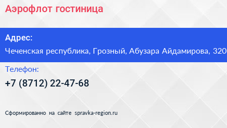 Аэрофлот, гостиница по адресу Чеченская республика, Грозный, Абузара Айдамирова, 320 в дальнейшем Организация, размещена в следующих категориях: