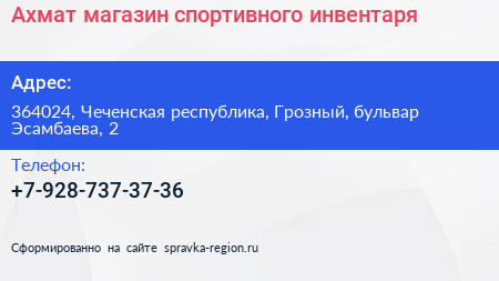 Ахмат, магазин спортивного инвентаря по адресу 364024, Чеченская республика, Грозный, бульвар Эсамбаева, 2 в дальнейшем Организация, размещена в следующих категориях: