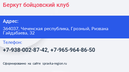 Беркут, бойцовский клуб по адресу 364037, Чеченская республика, Грозный, Ризвана Гайдабаева, 32 в дальнейшем Организация, размещена в следующих категориях: