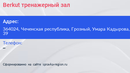 Berkut, тренажерный зал по адресу 364024, Чеченская республика, Грозный, Умара Кадырова, 39 в дальнейшем Организация, размещена в следующих категориях: