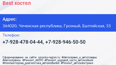 Best, хостел по адресу 364020, Чеченская республика, Грозный, Балтийская, 55 в дальнейшем Организация, размещена в следующих категориях: