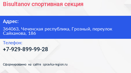 Bisultanov, спортивная секция по адресу 364063, Чеченская республика, Грозный, переулок Сайханова, 186 в дальнейшем Организация, размещена в следующих категориях: