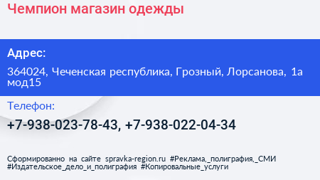 Чемпион, магазин одежды по адресу 364024, Чеченская республика, Грозный, Лорсанова, 1а мод15 в дальнейшем Организация, размещена в следующих категориях: