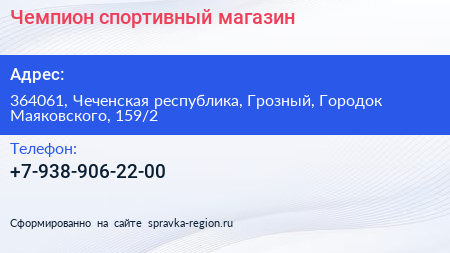 Чемпион, спортивный магазин по адресу 364061, Чеченская республика, Грозный, Городок Маяковского, 159/2 в дальнейшем Организация, размещена в следующих категориях: