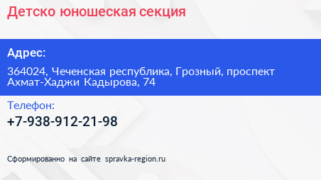 Детско-юношеская секция по адресу 364024, Чеченская республика, Грозный, проспект Ахмат-Хаджи Кадырова, 74 в дальнейшем Организация, размещена в следующих категориях: